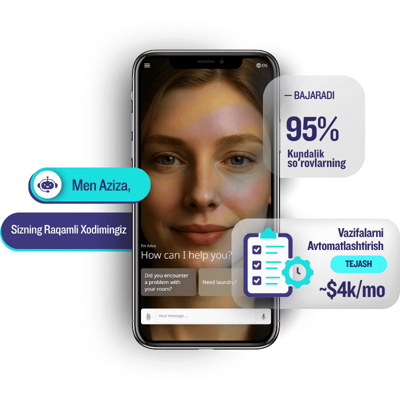 Yoʻq. Maqsad xodimlaringizni almashtirish emas, balki ularning imkoniyatlarini kengaytirishdir. Assistentingiz takrorlanuvchi, koʻp vaqt talab qiladigan soʻrovlarni oʻz zimmasiga oladi, bu esa jamoangizni ortiqcha yuklamadan xalos qiladi va ularga eng yaxshi ishlarni qilishga imkon beradi: mehmonlarga yuqori darajadagi shaxsiy xizmat koʻrsatish. U charchamaydigan hamkor sifatida ularning ishini osonlashtiradi va samaraliroq qiladi.